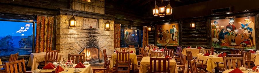 Gourmet dining in an atmosphere of historic and casual elegance describes this world-class dining experience. Located in the historic El Tovar Hotel, this celebrated and majestic Dining Room is constructed of native stone and Oregon pine. The murals on the walls reflect the customs of four Native American Tribes – the Hopi, the Apache, the Mojave and the Navajo. The ambiance is rustic but classic and traditional. You can imagine the countless number of intriguing characters that have dined here in the past. Guests such as Teddy Roosevelt, President Bill Clinton, and Sir Paul McCartney have dined and shared stories within these walls. The menu is traditional, integrating both international and local Southwest influences. Signature items such as the Prime Rib Hash at Breakfast or the Salmon Tostada at Dinner have graced the menu for decades and become true classics. The Service Staff for the El Tovar Dining Room are consummate professionals; many have been with the restaurant for over 20 years. The El Tovar Dining Room is considered the premier dining establishment at the Grand Canyon and is recognized internationally.